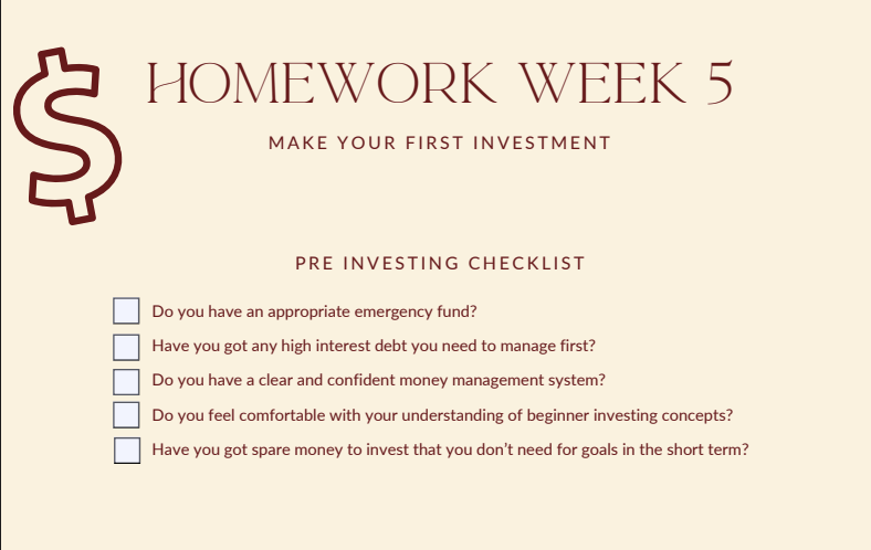 Tasks designed to move you from learning into action. These weekly tasks help you take small, manageable steps to becoming an investor — so by the end of the course, you’ll have done the work to make your first investment.